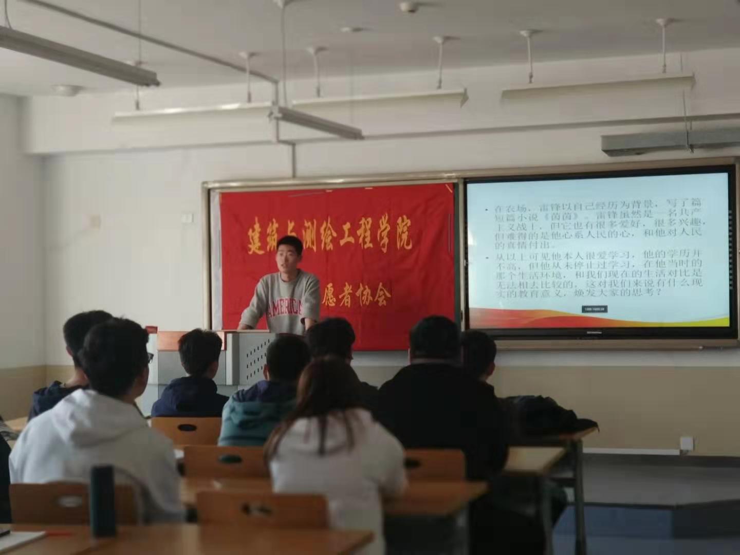 三月是一个春光明媚、生机勃勃的季节,三月也是一个讲文明、树新风,让雷锋精神吹遍校园每一个角落的季节。为进一步学习和弘扬雷锋精神,在3月5日我校建筑与测绘工程学院青年志愿者协会的号召下,组织了各班班长和团支书参与了 “学习雷锋精神”的有奖讨论会在善技楼507举行。