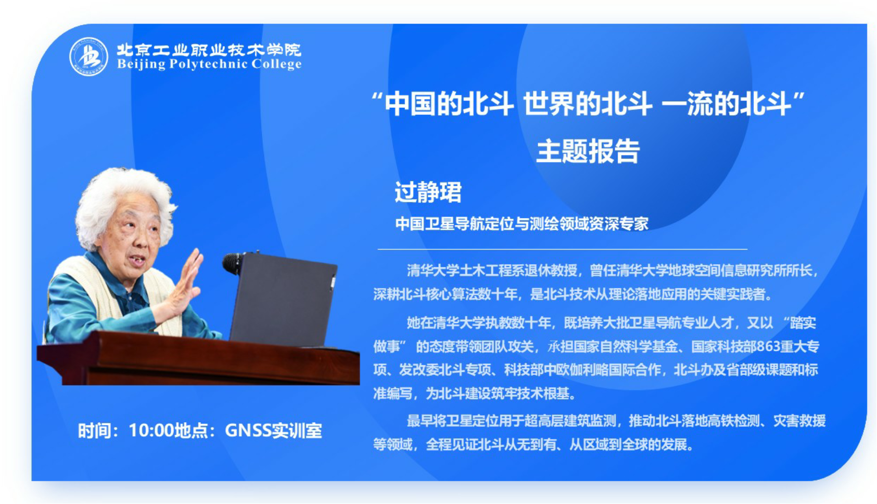 2025年10月24日上午,北京工业职业技术学院建筑与测绘工程学院迎来一场兼具专业深度与家国情怀的学术盛宴。清华大学地球空间信息研究所教授、原所长过静珺应邀莅临北京工业职业技术学院,为建筑与测绘工程学院导航位置服务专业的师生作了题为《北斗:我国国防重器与国民经济建设基石》的专题讲座。讲座由院党总支书记贺继伟主持,建工学院师生共同聆听。