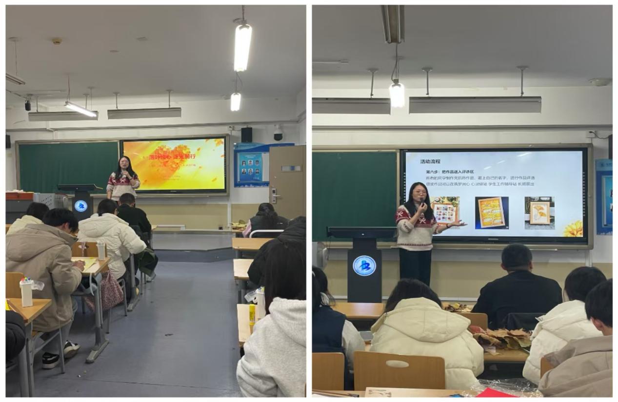在主题引导环节,学院心理辅导员王黎萍老师于善技楼513教室,以“落叶与生命对话”为切入点,结合理论阐释与实例分析,说明了自然媒介在情绪调节中的积极作用。她指出,“落叶从萌发至凋落的生命历程,恰如人生成长的缩影,既有收获的喜悦,亦有面对挑战的勇气。本次活动旨在引导同学们通过自然观察与艺术创作,在自我对话中深化觉察,实现真实接纳。”